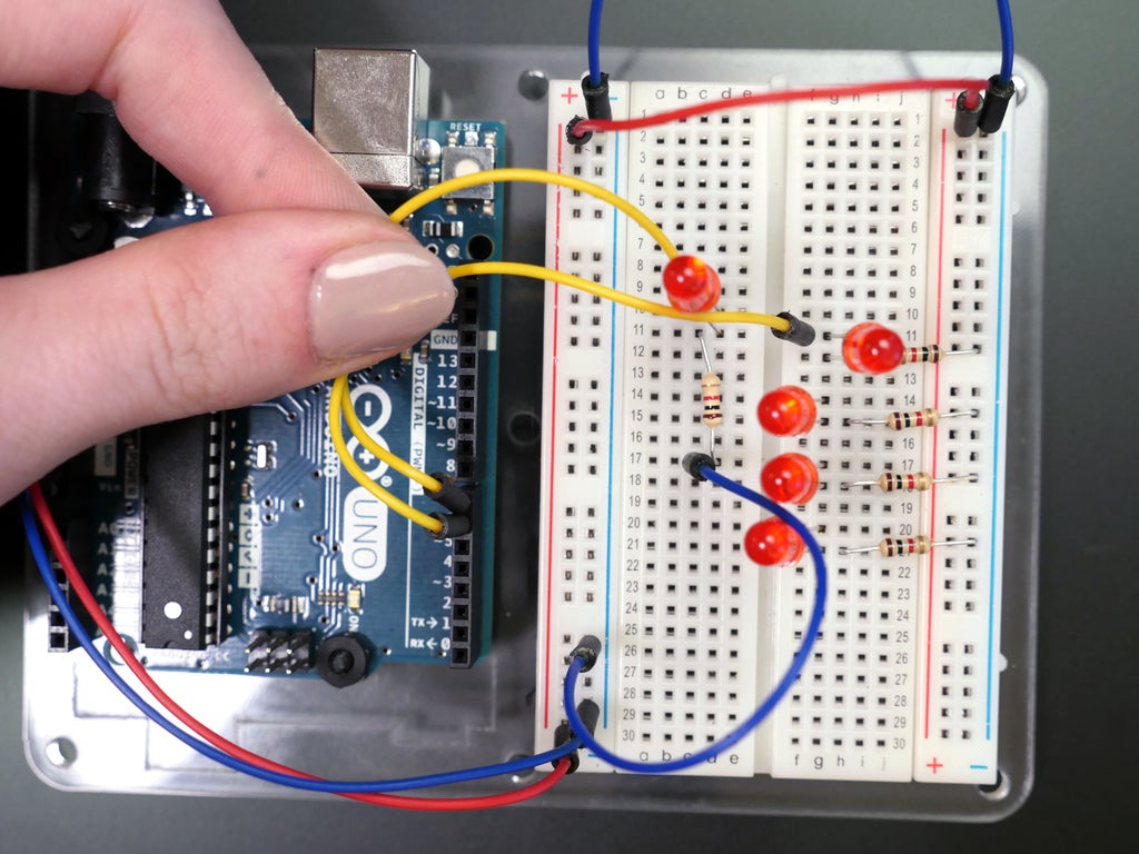 Now that you've got the basic idea of how to control a single LED, let's attention deficit disorder some more! Grab the quietus of your ruddy LEDs and 1K resistors. Unplug your Arduino from USB/power if IT wasn't already. Information technology's clever to disconnect power any time you are changing your circuit.