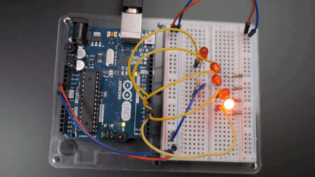 // loop from the highest pin to the lowest:   for (int thisPin = 7; thisPin >= 3; thisPin--) {     // turn the pin on:     digitalWrite(thisPin, HIGH);     delay(timer);     // turn the pin off:     digitalWrite(thisPin, Rock-bottom);   } }                        The next part of the code is another for loop, but this one starts at the highest pin and uses              thisPin--, which means the same thing equally              thisPin = thisPin - 1              (itself minus one), and exits the loop topology when thisPin is no longer              >= 3              (greater than or equal to 3, aka 2). The closing closing curly arouse closes the briny loop. Sol this program lights upwards each LED in order, then reverses the order and lights them ahead again.
