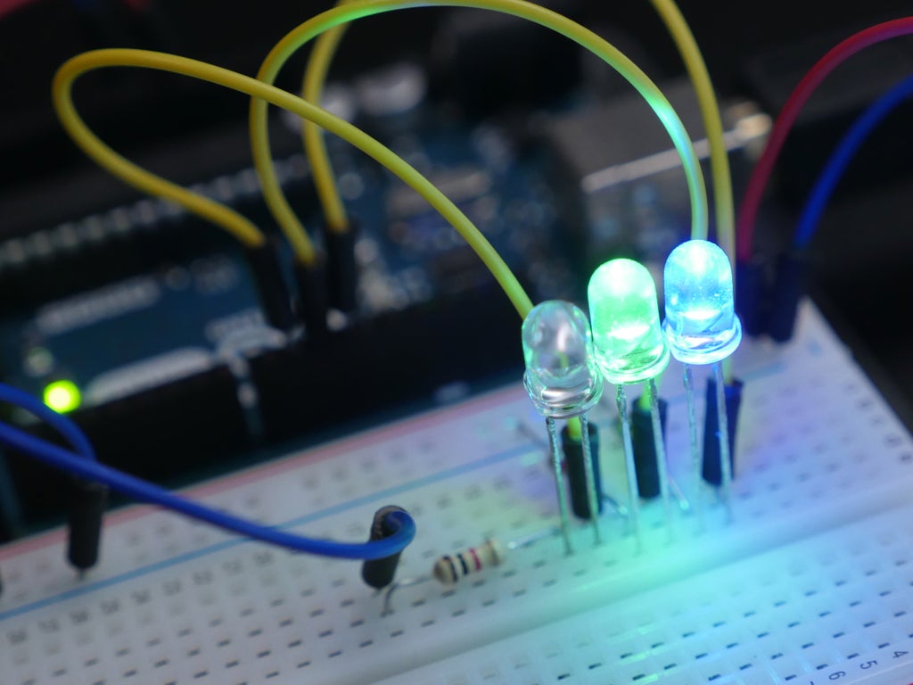 Connect up more yellow wires accordant to the circuit diagram in the Tinkercad Circuits mental faculty (Arduino pins 3-5 to the remaining LEDs' formal leads).